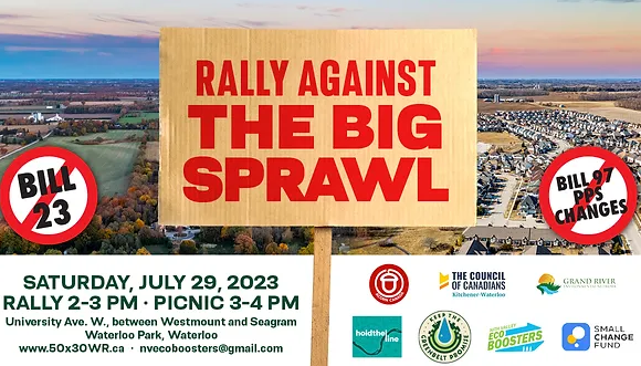Rally Against the Big Sprawl, July 29th Waterloo Park, Waterloo Ontario. Join Waterloo Region groups in a rally and picnic to build public opposition to provincial moves to force urban sprawl in Waterloo Region.